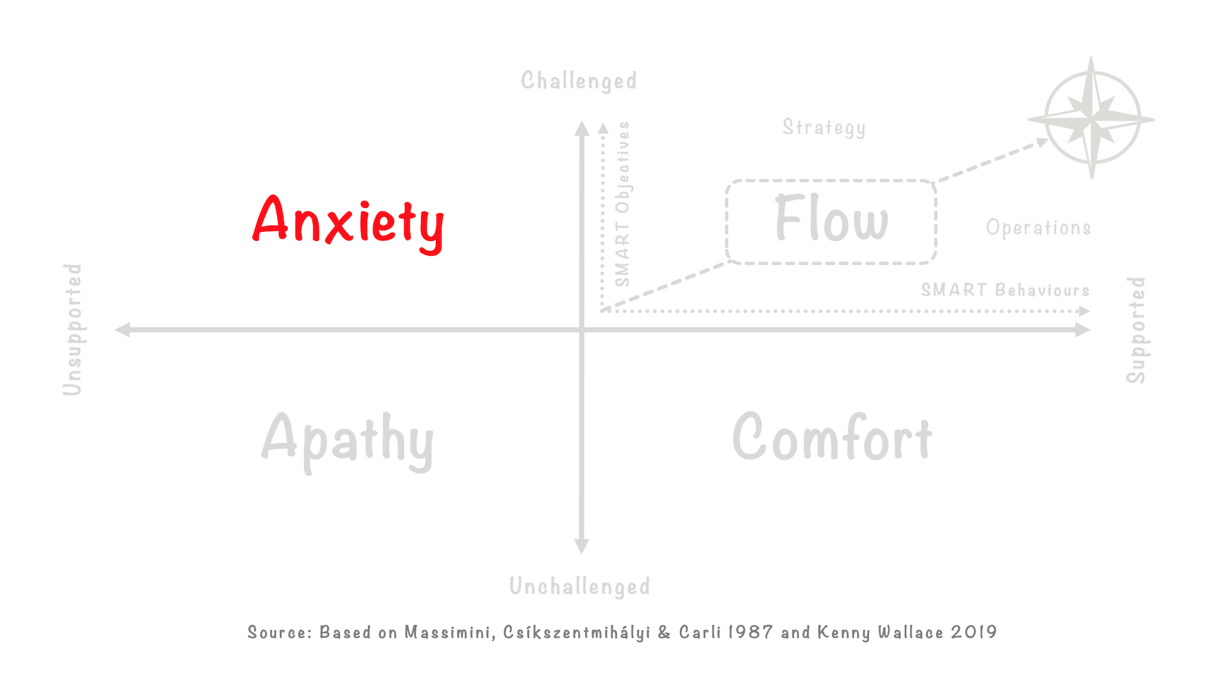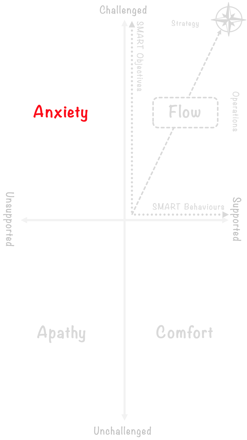 We have already learned from the previous models that anxiety directly correlates with a lack of knowledge and skill, i.e demonstrable incompetence. The example of our senior leader gives us insight on how that might manifest in an individual and we now also know that with mathematical certainty 84% of your organisation will spend the majority of the transformation in the Anxiety quadrant, causing inevitable costly delays, stall your project or cause it to fail all together.