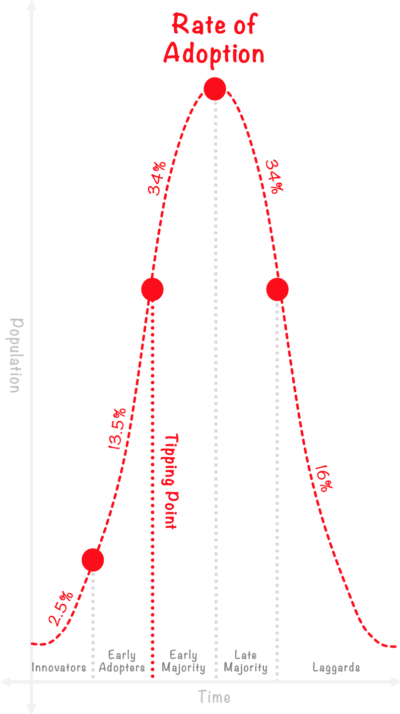 We can now correlate what we’ve learned about certainty vs uncertainty within any given population, which can also be broken down in to 5 key stages to predict the rate of adoption.