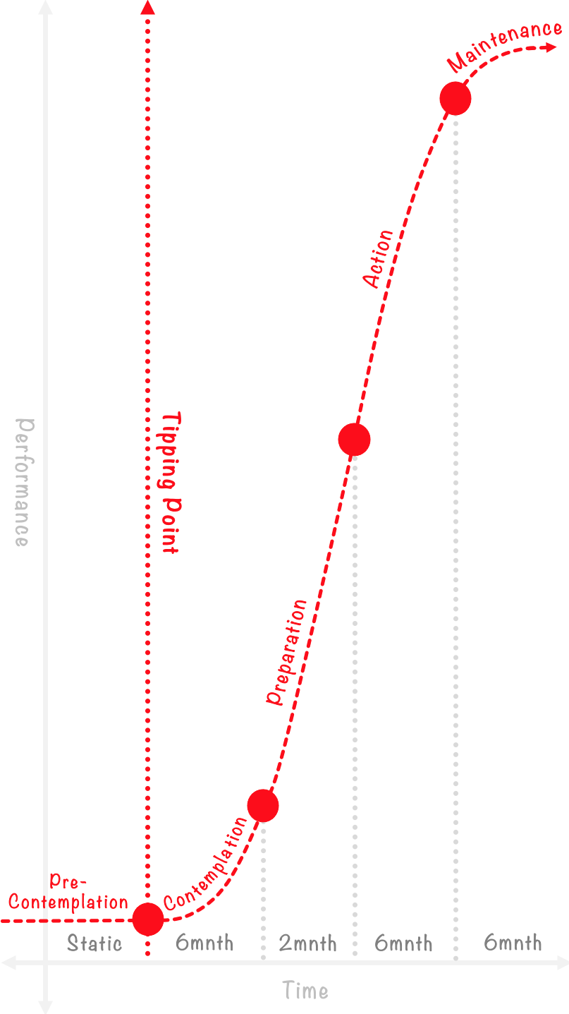In terms of openness to change, every participant, will land in one of 5 categories prior to, and during any organisational transformation: Pre-Contemplation, Contemplation, Preparation, Action and Maintenance. These 5 stages provide a timeline demonstrating that human adoption of change will lag considerably behind structural change. Each participant will progress at different rates as they contend with the short and long term professional and personal impact, such as the severance of positive anchors, which we all use daily as hand-rails that enable us to manage a vast array of complex tasks.