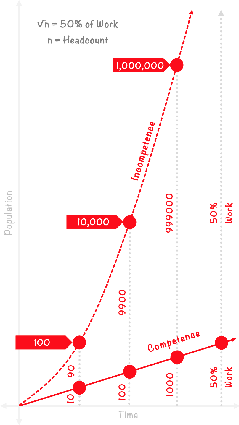 This model demonstrates in any given population Competence increases linearly and Incompetence increases exponentially, proving that as a business becomes larger it becomes less capable with every hire. To put this in financial terms let’s take a headcount of 100, and to keep things simple let’s assume they are each paid £10,000 with a total salary bill of £1million. The first 10 earning a total of £100,000 buys you the same output as the remaining 90 earning a total of £900,000.